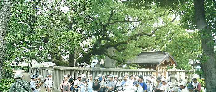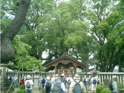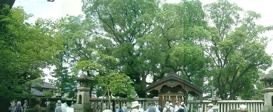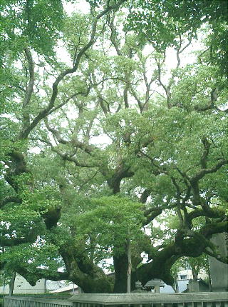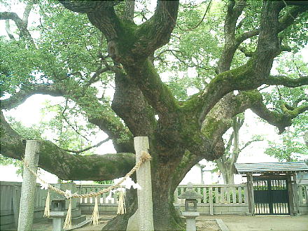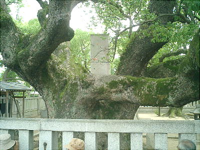 て、小さな石碑を挟み込み、1本の大木になった。今では樹齢575年、幹周り12mの楠の巨木に