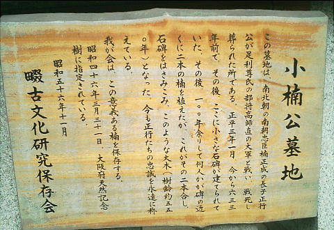 正行の自刃後、ここに正行は一族とともに葬られている。小楠公首塚というのが京都市右京区の清凉