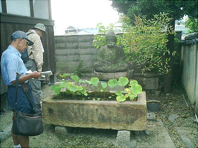 中野正法寺境内にある水槽(上右)は古墳時代の石棺の身で、国中神社にある蓋とは別のものである。