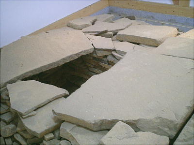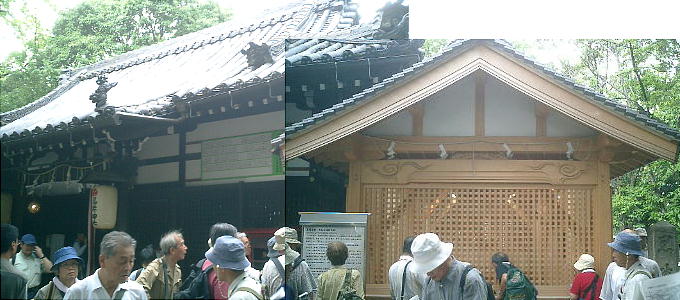 上左の写真、奥の方で麦わら帽子を被って歩いている人が野島さんである。覆屋の立て替え作業。