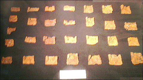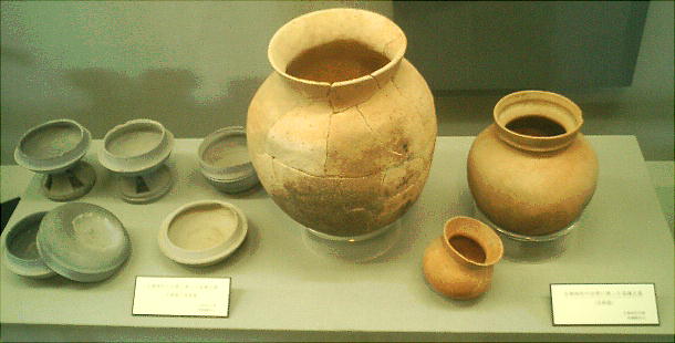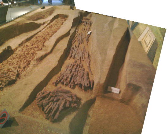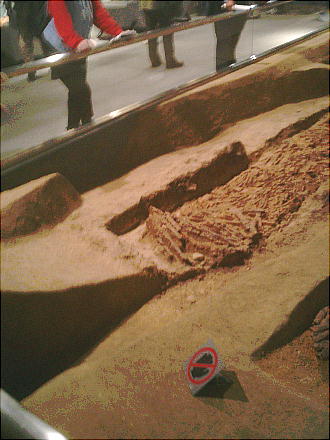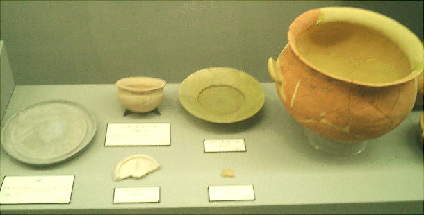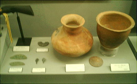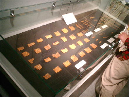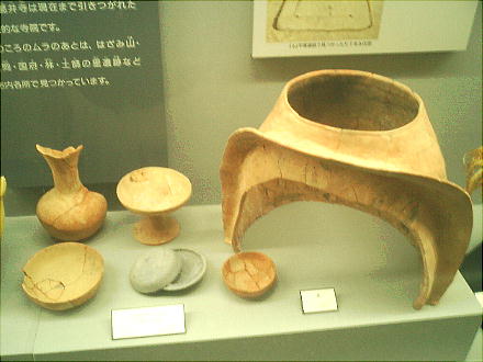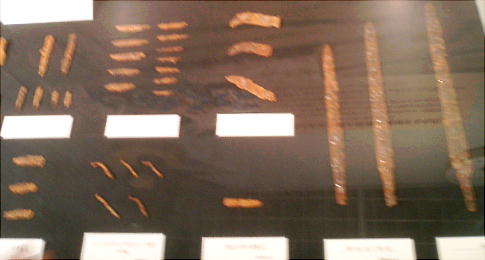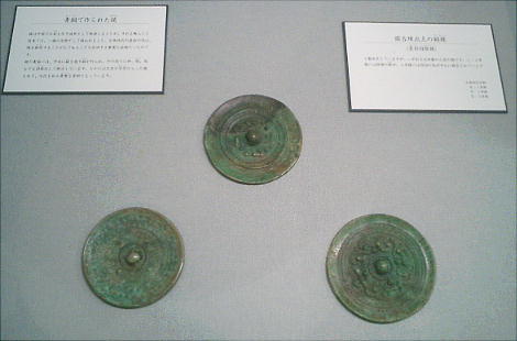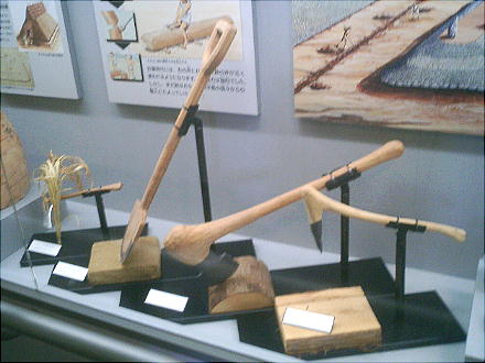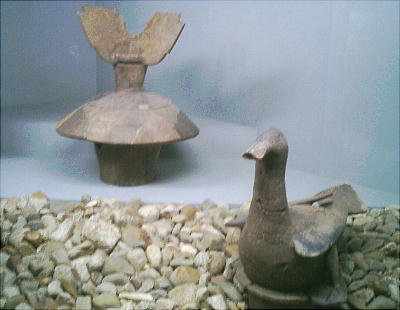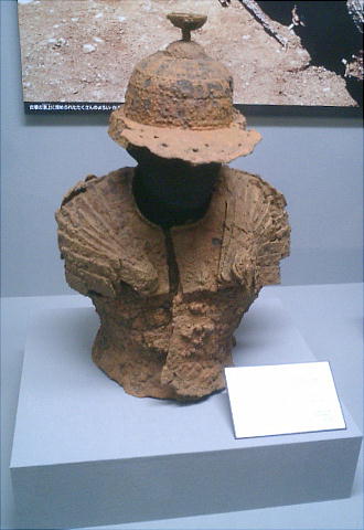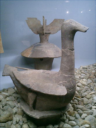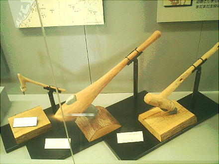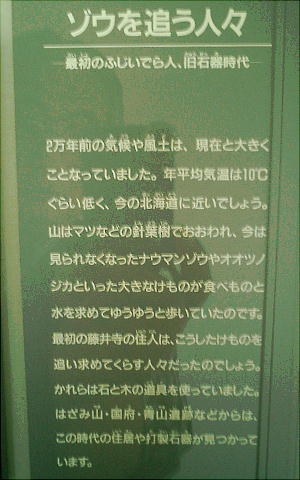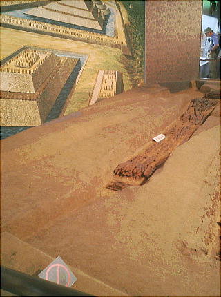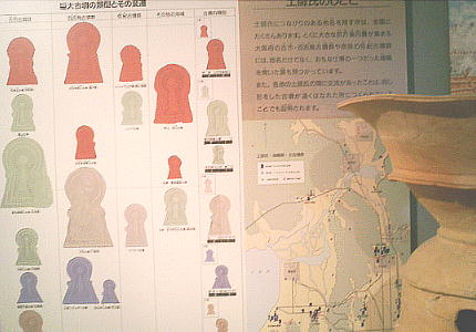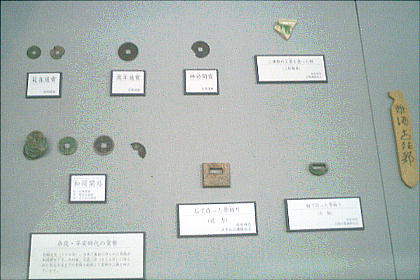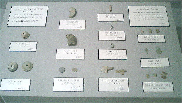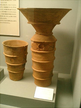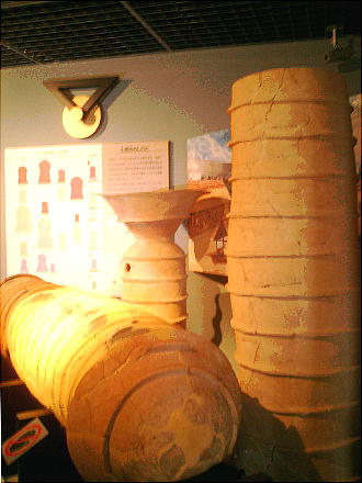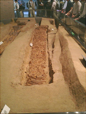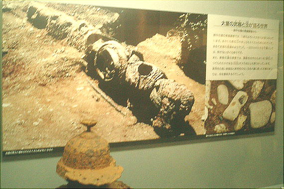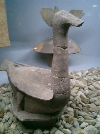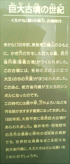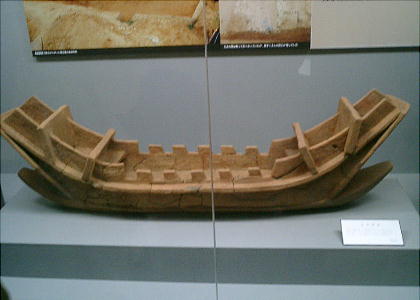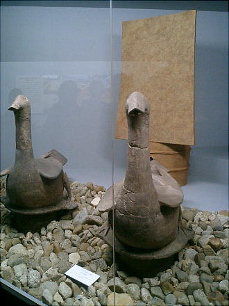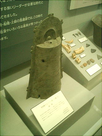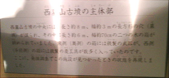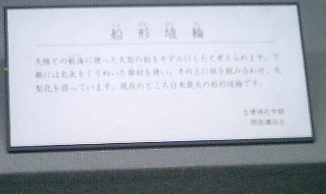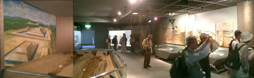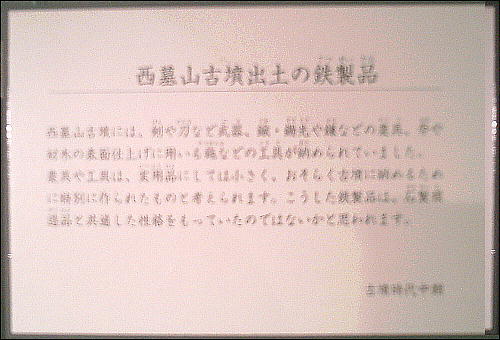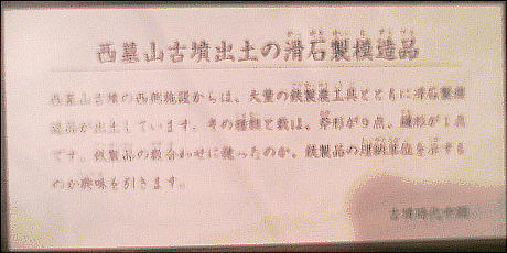 <アイセルシュラホール展示室> 2階に簡単な藤井寺市の歴史を考古遺物で説明しているほか、西墓山古墳の主体部(鉄器埋納施設)を切り取った実物展示 や、土師ノ里8号墳の埴輪円筒棺・副葬品、野中古墳の出土遺物、津堂城山古墳の水鳥形埴輪、岡古墳の舟形埴輪などを展 示しています。
