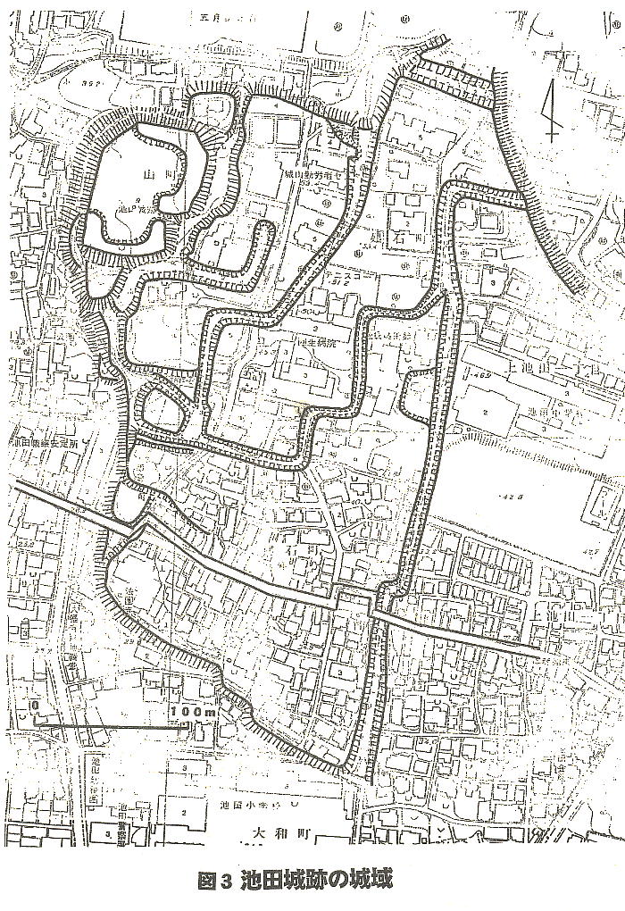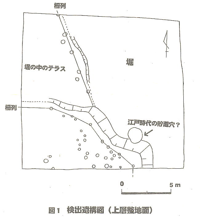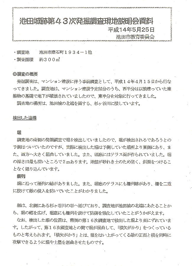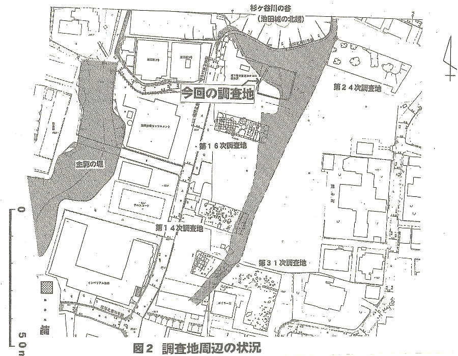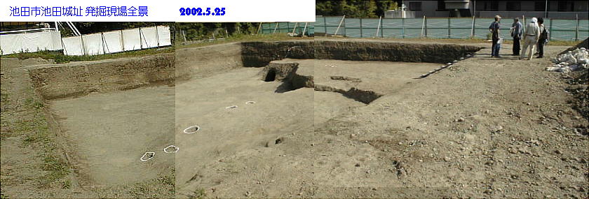 この部分は池田城の北端にあたり、濠の内側に立つ塀跡が並んで検出され、これまでの発掘調査の延長線上にあることが確 認されたという。江戸時代の貯蔵穴と思われるものも検出された。