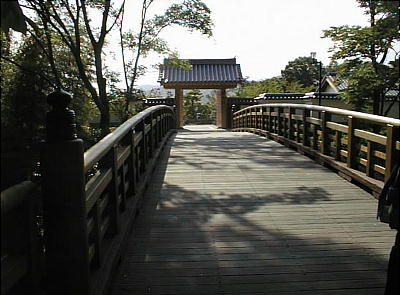 城山勤労者センター脇から入る東門。空堀の跡にかかる木橋を超えて庭園へ入っていく。「大手門」という看板がかけられているが、
