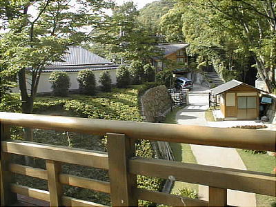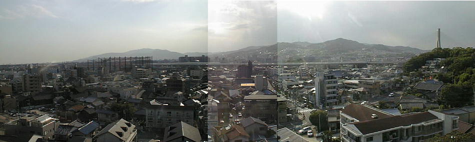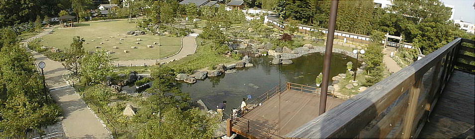 櫓風展望台からは、日本庭園のみでなく大阪平野も一望できる素晴らしい眺望である。猪名川にかかる高速道路橋ビッグハープも右隅