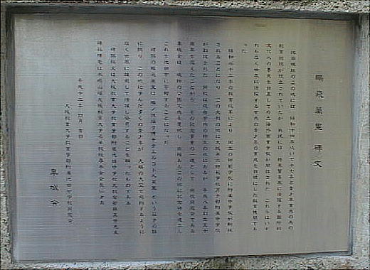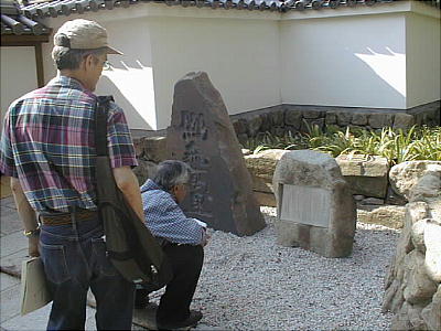 下は、池田師範の由来の碑(上)を読む河内さんと河原さん。池田師範はやがて大阪教育大学となり、その付属小学校が池田にもあっ