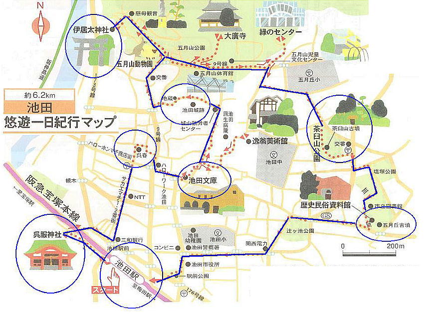 今日の例会は夜の部が主体なので、集合は午後2時であった。阪急池田駅に集合して上記地図の円内をゆっくりと散策し、後は河原邸