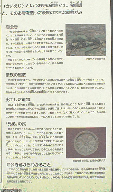 海会寺と同じ笵で作られた同笵の山田寺式の瓦が出土した。同寺は最初の天皇発願の寺、百済大寺と推定されている。