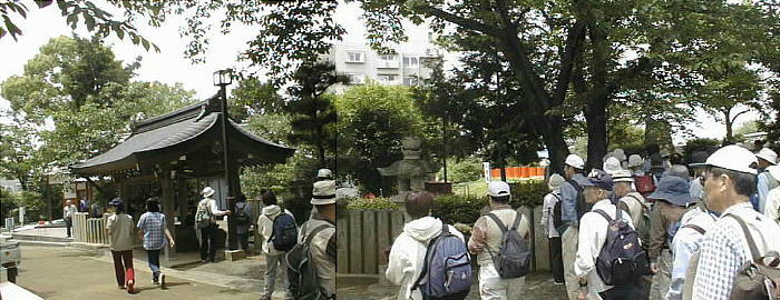 現海会寺跡に立つ神社。境内には海会寺の礎石があったが、近年の改築に伴い公園内に移動された。この日は近所の若者