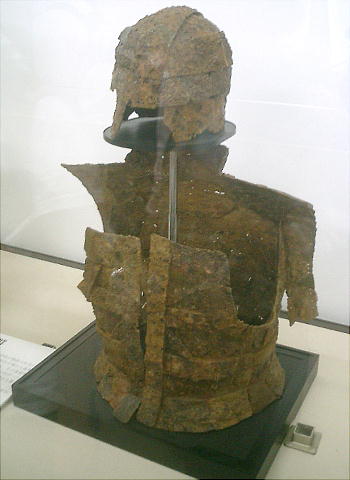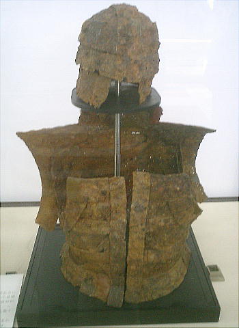 襟付短甲、三角板革綴衝角付冑、石釧、琴柱形石製品、鉄製農耕具等々が遺物として残っていた。その配列から被葬者は複数で