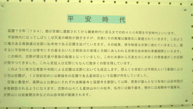 平安時代、天野川の水辺や丘陵地帯は狩猟に適し、天皇、皇族、宮廷人がたびたびこの地方を訪れたと、続日本記、日本後記に