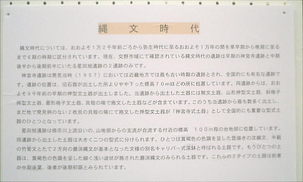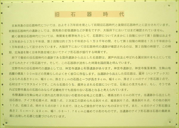 交野に人が住み始めたのは、今からおよそ2万年前頃とされ、縄文時代の遺跡として「神宮寺遺跡」、弥生時代の遺跡では