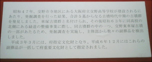 されることになり、事前に試掘され発見された。5世紀初頭から6世紀頃の5基の古墳群からなる。交野東車塚南古墳は、他で