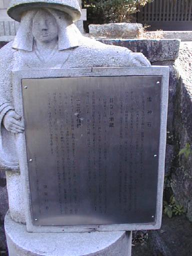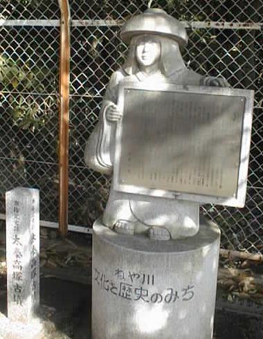 寝屋川市内では、文化財のすぐ側に「鉢かつぎ姫」の石像が立っており、その由来を説明してくれている。