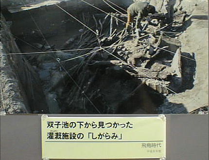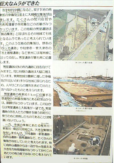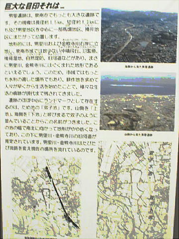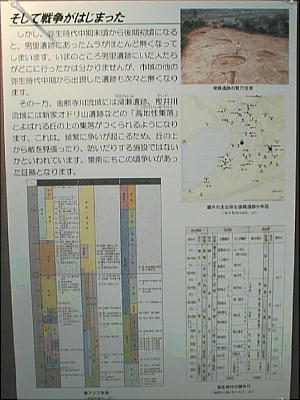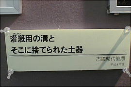 とが明らかになっている。また、幅約10mの蛇行する大溝が検出され、大量の土器が廃棄された状態で出土した。居住域か
