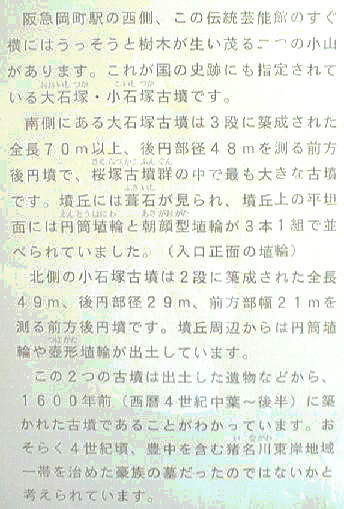 下は豊中市の「伝統芸能館」という建物だが大石塚古墳のすぐ側に建てられている。と言うより古墳を浸食している。下右