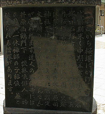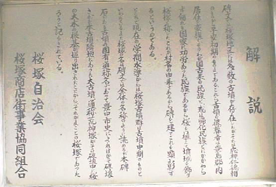 このあたりが、かって「桜塚古墳」と呼ばれた古墳の密集地だったことを示す碑。桜塚古墳群には、明治時代(明治7年)の絵図によ れば36基の古墳があった事が知られているが、今では見てきた「大石塚・小石塚」古墳の他に、「大塚」「御獅子塚」「南天平塚」 の計5基を残すのみである。しかし近年の発掘調査により多量の鉄製品をはじめとする副葬品が出土して、新たな注目を受けている。