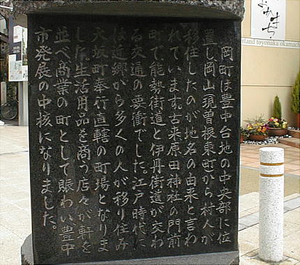 大石塚・小石塚古墳から伝統芸能館を見て、また阪急電鉄「岡町」駅へ戻る。駅前には例の「町案内碑」が立っている。たぶん大阪府 が建てた物だと思う。枚方の樟葉駅前と阪急水無瀬駅から入った「史蹟・櫻井駅」前にもあった。