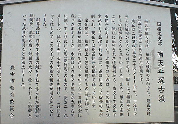 昭和12年に調査が行われ、帆立貝式の前方後円墳であるとされたが、平成3年の再調査で直経約24mの円墳であること が確認された。以下調査時の記録に依れば、本来の墳丘は全長28m、後円部経21.5m。埋葬施設は後円部で2基の木 棺が確認された。そのうちの1基は長さ2.9mの高野槇製で、副葬品としてイ方製変形六獣鏡、鹿角製装具付太刀、三環 鈴、短甲、鉄鏃、櫛、槍の他、漆塗りの弓三張が出土している。 もう1基は、棺材の残欠が確認されただけで詳細は不明 であるが、掘り形が約4.7mあり、3m位ではないかと推定されている。副葬品には、衝角付冑、短甲、刀、剣、鉄鏃、 鉾、木弓、革製縫楯などの武具のほか、鞍橋(くらぼね)金具、輪鐙(わあぶみ)などの馬具、イ方製鏡が出土している。
