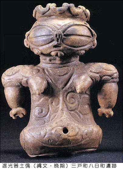(二戸市金田一字雨滝の雨滝(あめたき)遺跡。遮光式土偶など。秋田県仙北郡神岡町小沢(おざわ)遺跡。住居跡、遮光