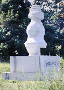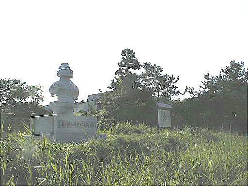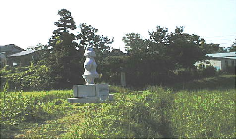 遮光式土器が発見された場所に建てられている、亀ケ岡遺跡の碑。道路脇の畑の土手の上である。