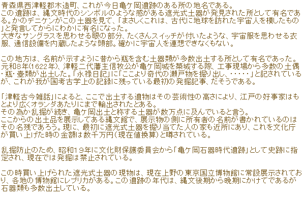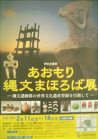 以下は、2007.2.11から1週間だけ大阪市立歴史博物館で行われた「あおもり縄文まほろば展」の様子。ここに亀が岡の出土品もあった。