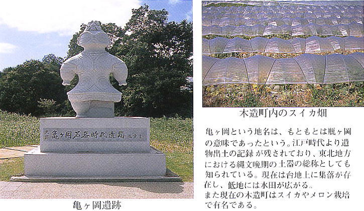 出土した遺跡として知られ、国の史跡に指定されている。単に亀ヶ岡遺跡とも称される。亀ヶ岡時代遺跡とモニュメント右の写真