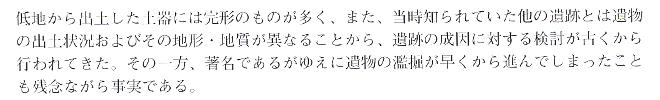 あって日本海側と太平洋側に距離を隔てているが、海岸の近くに位置しながら貝塚を伴わない遺跡であること、居住の立地