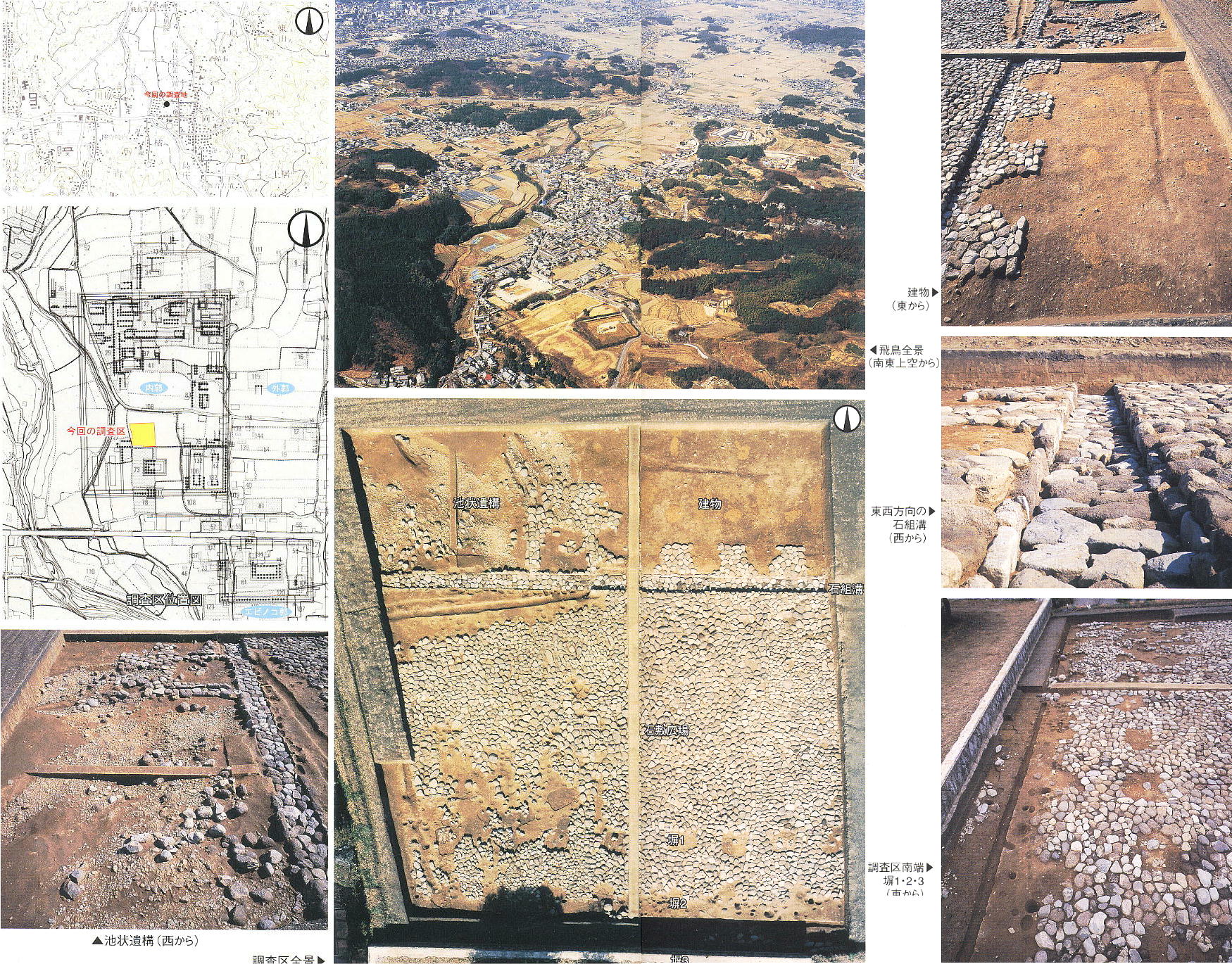 今回の調査では、V期(後飛鳥岡本宮・飛鳥浄御原宮)にあたる巨大な建物とその南にひろがる石敷広場を検出