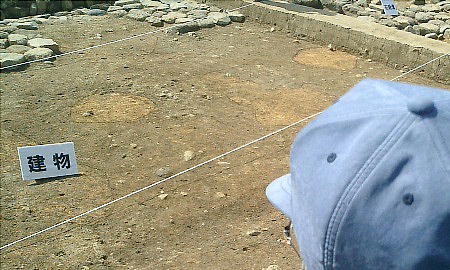 建物の部分に土の色が変わっているところがある。これが柱の跡である。これで建物が建っていたという事がわかる。