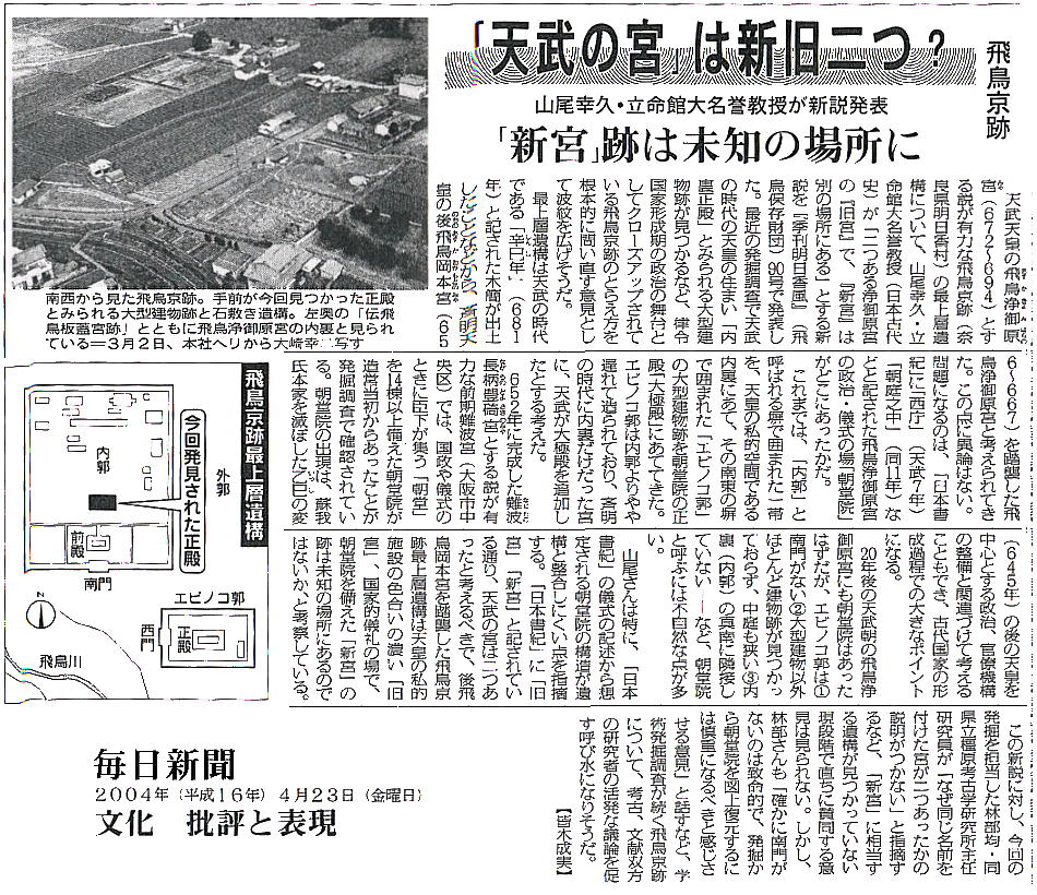 しても、「天武天皇の住居跡?・書紀の「皇親政治」裏付け」(産経)、「古代の宮廷 宴の跡」(毎日)、「律令