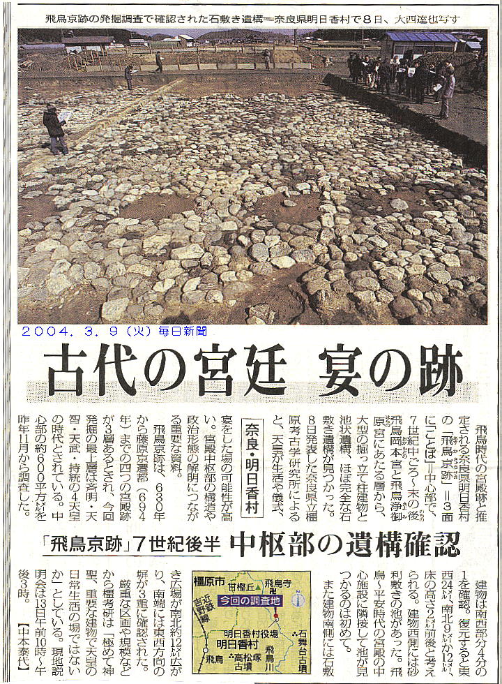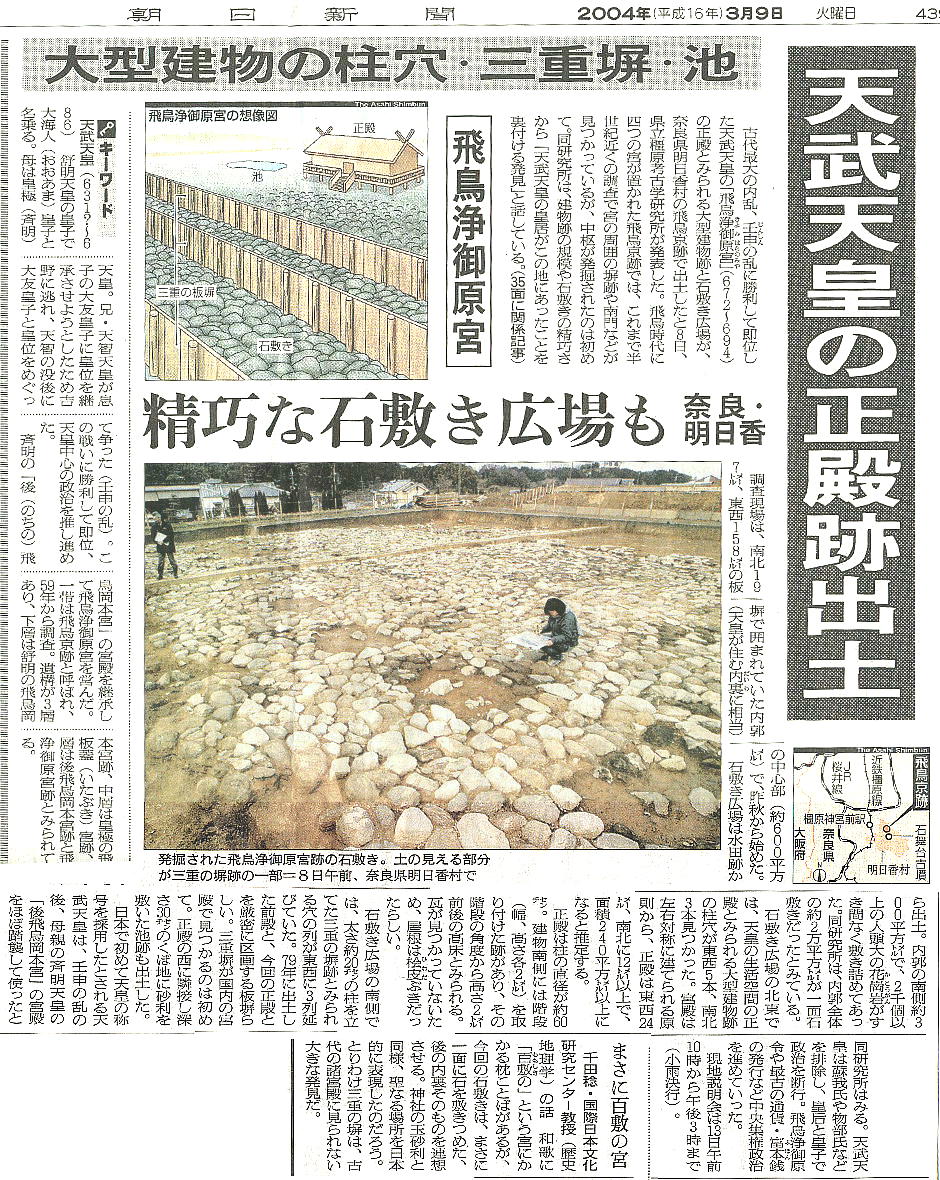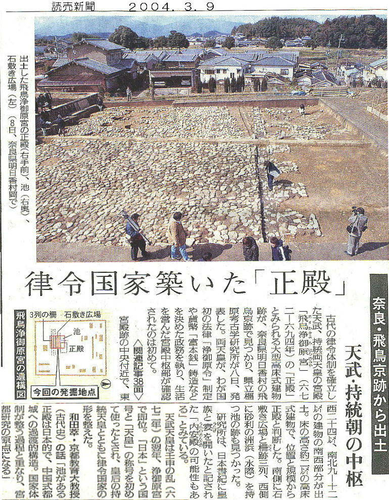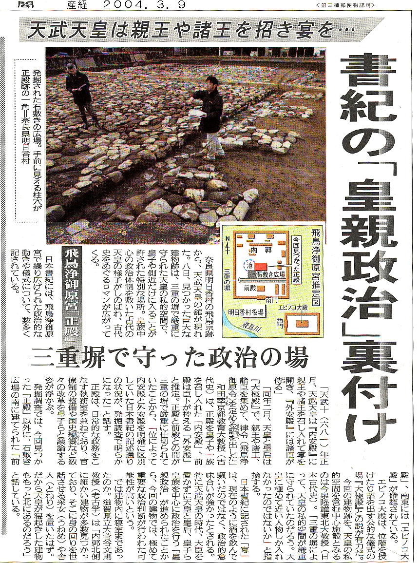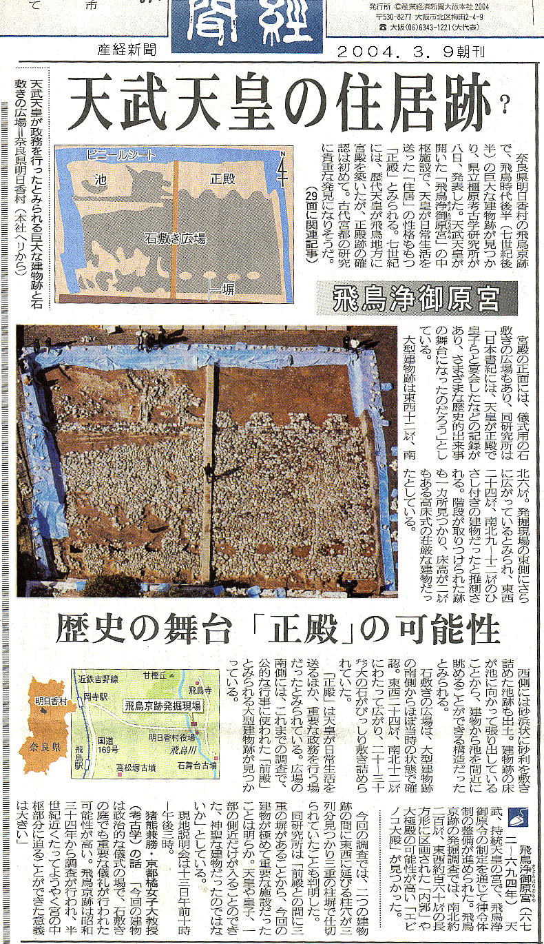 2004年3月9日付けの各社新聞に「飛鳥京跡で正殿跡見つかる!」という記事が載った。各記事の見出しだけを取りだ