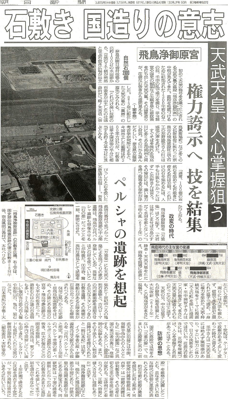 国家築いた正殿・政務の要 池では宴」(読売)、「天武天皇の正殿跡出土・石敷き国造りの意志」(朝日)と、歴