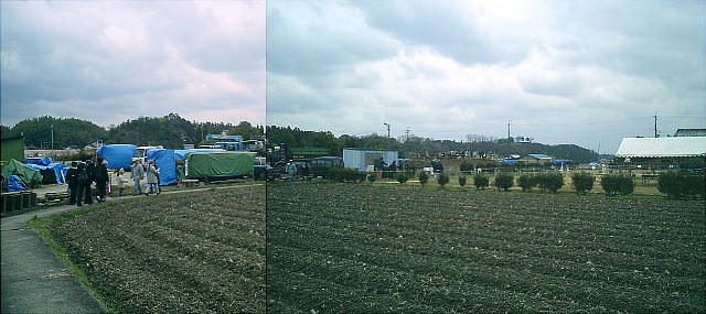 田んぼのあぜ道を歩いていくと説明会場が見えてくる。昨年もここへきたのだ。そう言えば同じ場所だ。
