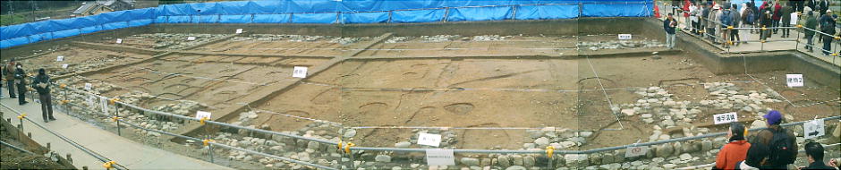 周辺は発掘をほぼ終了。後世の内裏に当たる「内郭(ないかく)」は、2つの正殿とやや小ぶりな建物が南北に