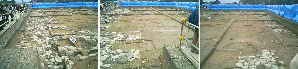 側は、昨年3月に出土した広大な石敷き広場で、その外側の三重の板塀にも正殿に至る正門が設けられておらず、