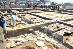 分で柱跡(直径約 80センチ)の列や石組み溝を確認。中軸線で折り返すと東西24メートル(八間)、南北12.2メ