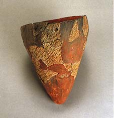 この時代の特徴的な 尖底土器 (せんていどき)で、切り刻んだ草を粘土に混ぜて焼かれている。