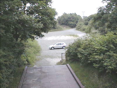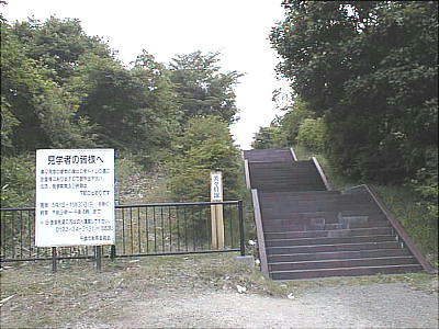 広いジャリを敷き詰めた駐車場があって、端の方に貝塚保存館への階段があり、そこに見学者への案内板が立っている。