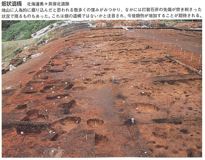 この貝塚の近くには、「畠状遺構(はたじょういこう)」と呼ばれる、畑のような外観を見せる遺構で実際に畑作が行われ