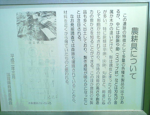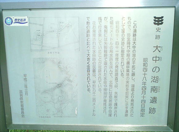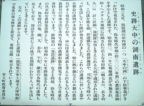 ・入江遺跡、長浜市の大辰巳遺跡などがあるが、大中の湖南遺跡は安土町と能登川町にまたがる地域で、弥生時代の水田跡