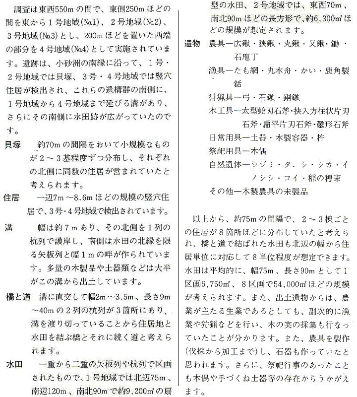 末期で終わっている。遺跡は大きく3つの部分に分かれており、それは、縄文時代末期、弥生時代中期、平安時代末期とな