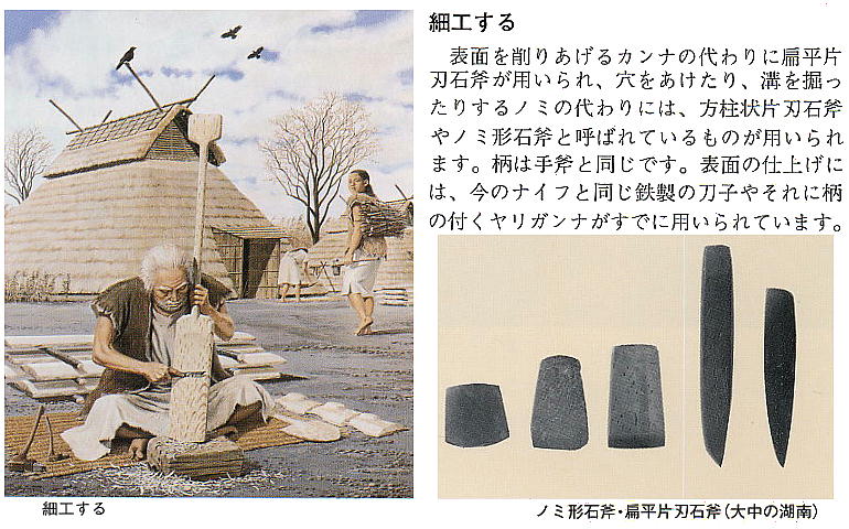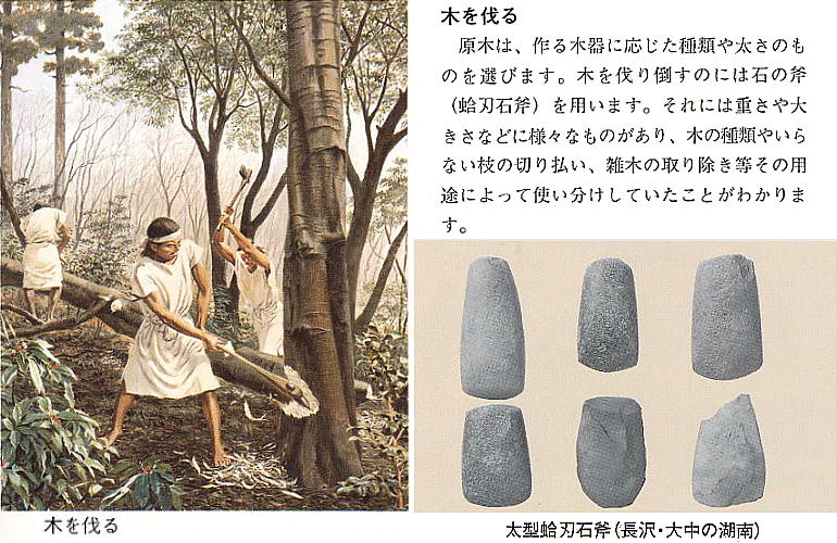 遺跡から出土している木製品は、鋤(すき)や鍬(くわ)などの農具、網枠や丸木舟などの漁具、弓などの狩猟具、石斧の