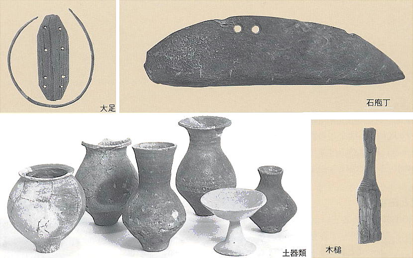 昭和40年、41年と行われた本格的な発掘調査の結果、多量の木製農具や土器、木偶、狩猟具、水田跡・住居跡などが発