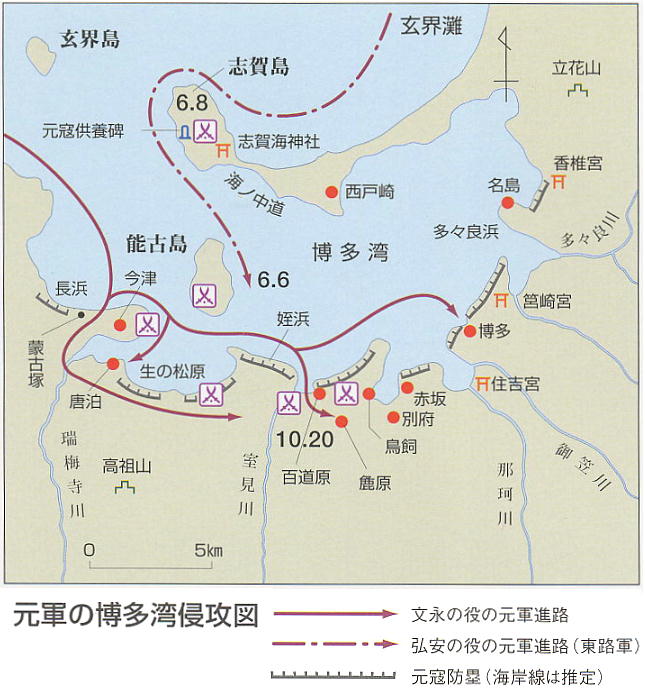 ら名島まで防塁が築いてあったので、防塁の無い志賀島に上陸し、ここが弘安の役の主戦場になった。日本軍は前回に学