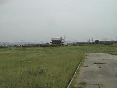 広大な平城宮跡が見える。発掘調査が終わった後埋め戻され、現在では雑草が生い茂り、史跡公園として整備される