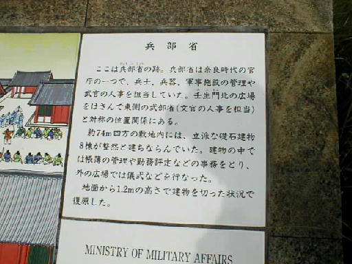 朱雀門近くの兵部省の跡とその説明板。平城宮の入口には、中央に朱雀門があり西に若犬養門、東に壬生門があり、壬生門