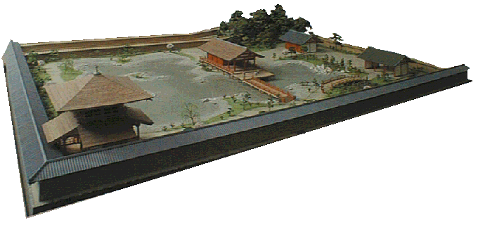 は石を敷き詰めた池や石組みのある築山、趣向をこらした建物や橋などからなり、当時の宮廷行事あるいは宮廷生活の優雅