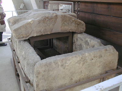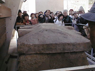 上はガイダンス棟内の石棺について説明する入江さん。石棺の蓋のでっぱりの変遷などを説明していた。