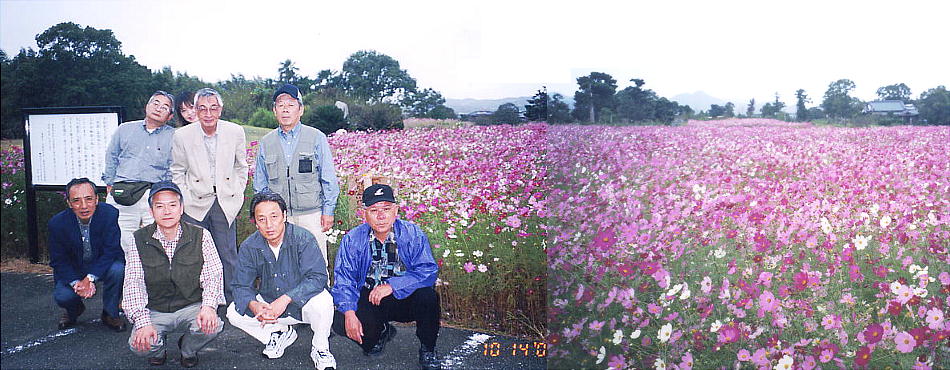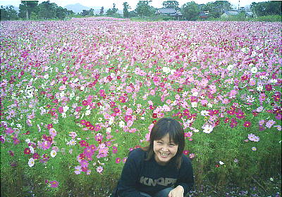 平原遺跡前の畑に一杯のコスモス。その前での智世ちゃん。上右は殉死溝のある東古墳。