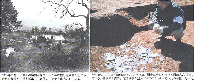 昭和40年糸島郡前原町平原(当時)において、農作業の最中に多量の朱と共に大小鏡の破片等が発見された。偶然の発見で